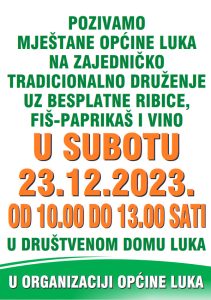 Pozivamo mještane općine Luka na zajedničko tradicionalno druženje uz besplatne ribice, fiš paprikaš i vino u subotu, 23.12.2023. od 10:00 do 13:00 sati u društvenom domu Luka u organizaciji Općine Luka
